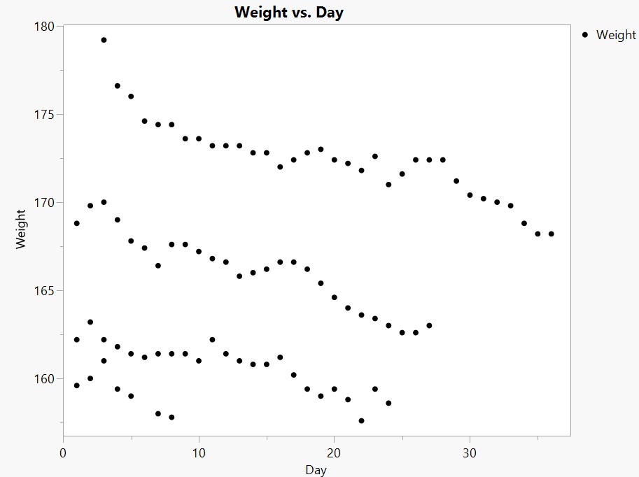 This graph shows the exact same weight data—but instead of plotting by calendar days, I aligned it by cycle days.