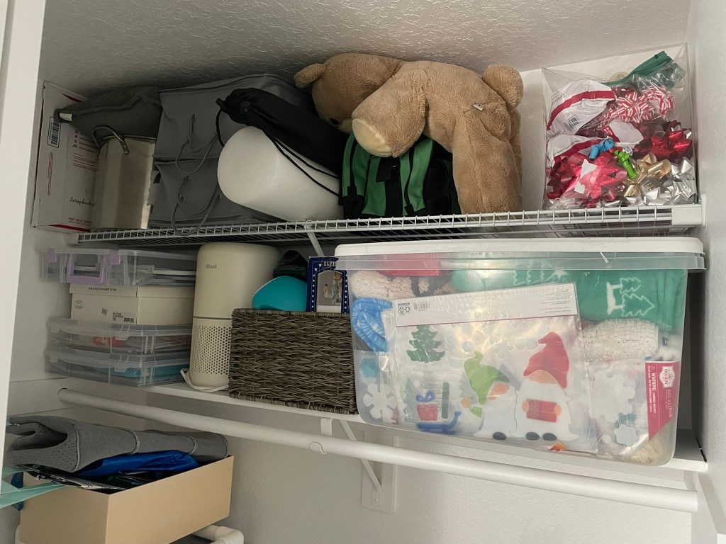 When we first moved in about three years ago, I loved that this closet was extra deep (thanks to the washer and dryer behind it). It originally held my craft supplies, holiday decorations, and a few sentimental items—like my teddy bear from when I was a baby. But as my hobbies evolved, so did this space.