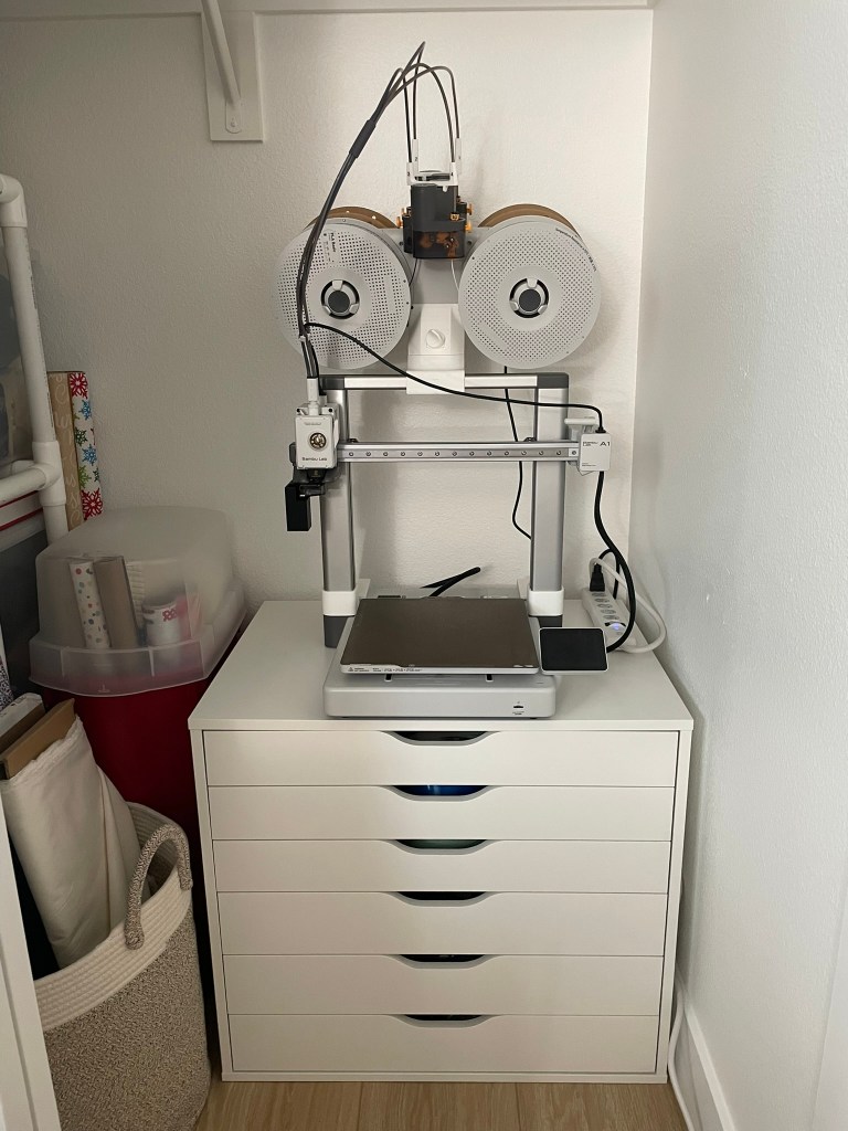 My printer lives in my craft room closet, perched perfectly on an IKEA drawer unit. It’s the ideal height, and each drawer fits six filament spools. I even 3D printed an attachment to mount the AMS on the A1 directly, so it doesn’t hog countertop space.