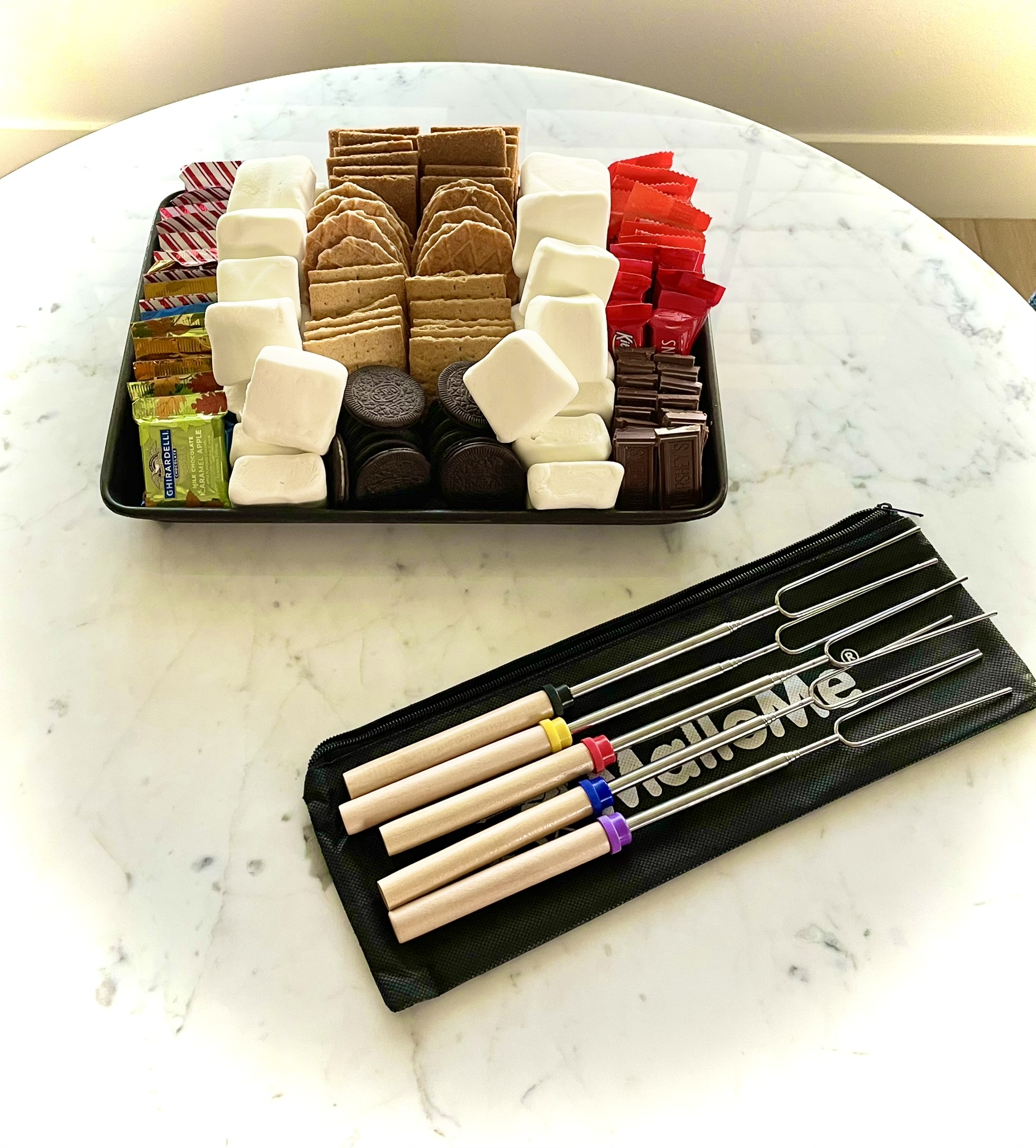 I prepped the sβmores platter earlier in the day, had my husband blow up the balloons, and one of my friends came an hour early to help with the cheese board.
